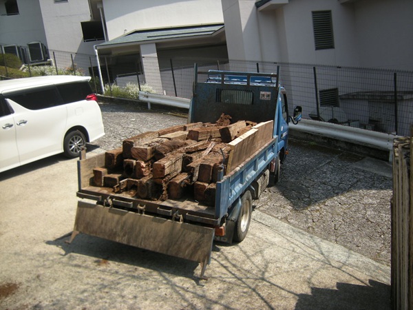 お庭の踏み石の代わりに置かれていた枕木の撤去と処分を承りました。